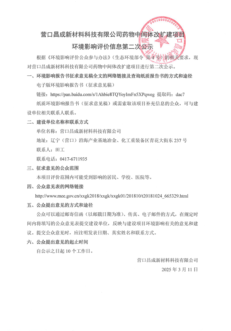 營口昌成新材料科技有限公司藥物中間體改擴建項目環(huán)境影響評價信息第二次公司